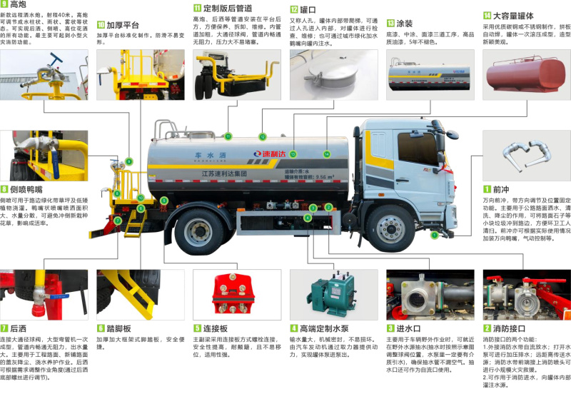 ● 采用專用定制版大功率水泵,具有性能優(yōu)良、工作可靠、效率高、流量大、等特點,前沖可達雙向8車道,后灑可達雙向4車道,高炮最大可達40米射程。
